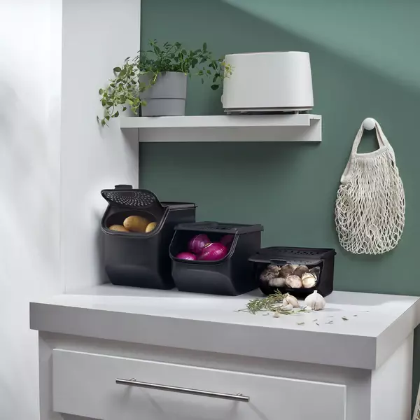 - Stapelbaar: ideaal om verschillende soorten aardappelen te bewaren. Ze zijn compact en passen perfect in een kast of onder de afwasbak.