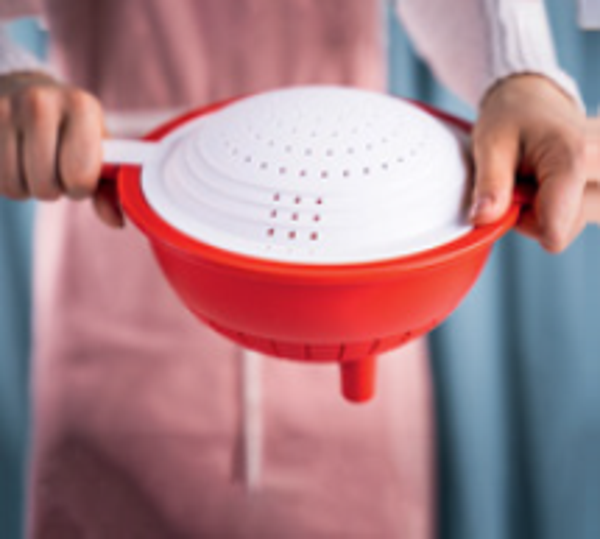 Gebruik beide vergieten afzonderlijk of voeg ze samen om gemakkelijk te spoelen. Stabiel dankzij verhoogde voetjes. Schuif de 2 delen in elkaar om het water eruit te schudden.